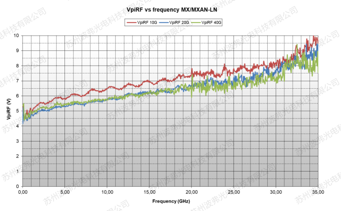 这是因为尽管与材料无关,但是设计和生产方面,任何射频电子零部件,随着频率的升高都会有射频的衰减,其功率从最高点下降到1/2的位置对应的频率,我们称为-3dB带宽(请参考微信文章“iXblue电光调制器常见参数定义”)。虽然材料本身的参数并不随频率升高而变化,但是波导的电极等射频部分不可避免的存在高频衰减,因此调制器的射频半波电压Vp RF随着频率的升高而升高。