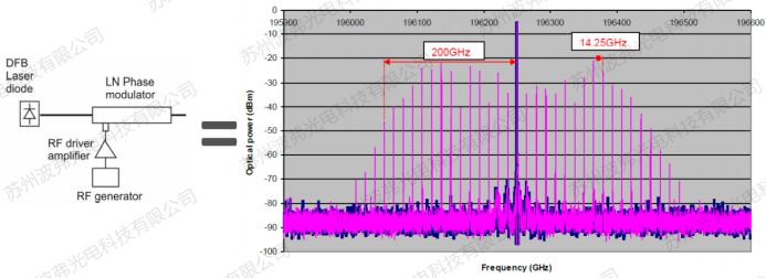 举例如下图,射频信号频率为14.25GHz, 根据驱动电压强度大小,可以产生10多阶边带,将载波光谱展宽至400GHz数量级。