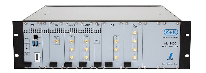 K+K KL-3400实时时钟的硬件由几个板组成,每个板都有一个前面板。可选的附加信号发生器(如5MHz或100MHz)、分配放大器等完成了画面。