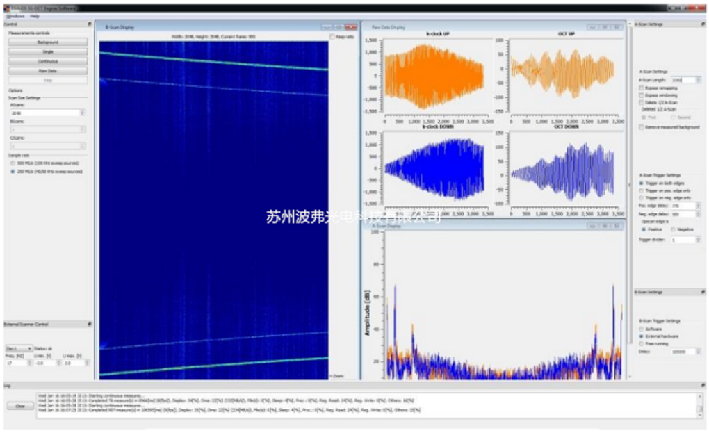 OCT信号处理基于k时钟信号采集,实时相位展开和先进的线性化算法,可实现类似于使用样条插值的离线处理的高质量A扫描。 光谱加窗,色散补偿和背景减法是实时独立进行的,用于前向和后向扫描。 显示引擎执行视频速率(> 25 fps)显示A扫描(每个阵列2,048个点)和B扫描(每个B扫描1024个A扫描)。更多产品完整信息,请联系xingkong星空光电科技有限公司,联系电话:0512-62828421,咨询邮箱:sales@ !