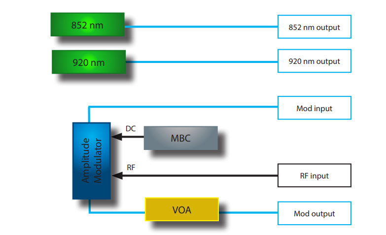 • 内嵌两个激光源,一个852 nm和920 nm低RIN DBR激光器。为了便于使用,省略了一根外部接插线,将激光输出连接到调制器输入光端口。波长和功率可通过前面板控制或ModBox软件接口进行调整。